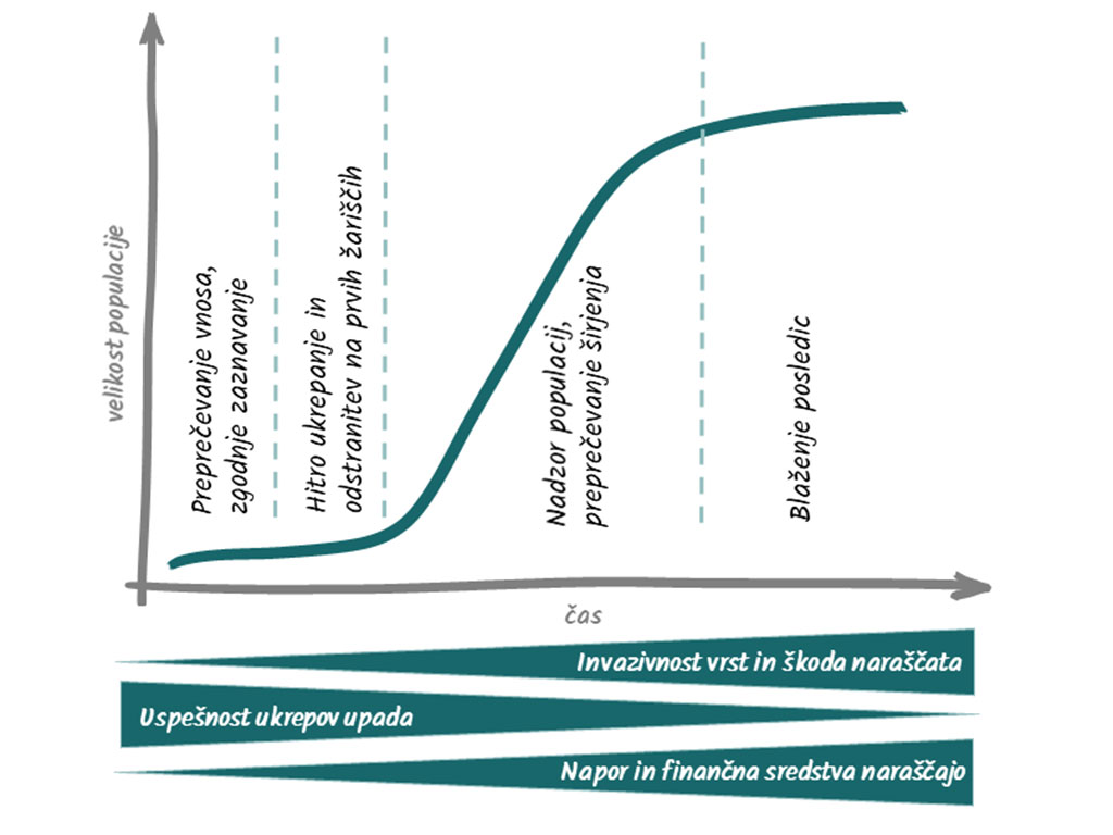 Za tujerodno vrsto ne moremo določiti jasne meje, kdaj postane invazivna. To je namreč odvisno od naše sposobnosti, da zaznamo in ovrednotimo škodo, ki jo povzroča vrsta, pa tudi od velikosti ekonomske škode ali nevarnosti za zdravje ljudi. Pri ravnanju s tujerodnimi vrstami veljajo več ravni ukrepanja. Tak način delovanja je prilagojen pričakovani populacijski dinamiki vrst.