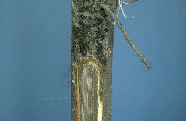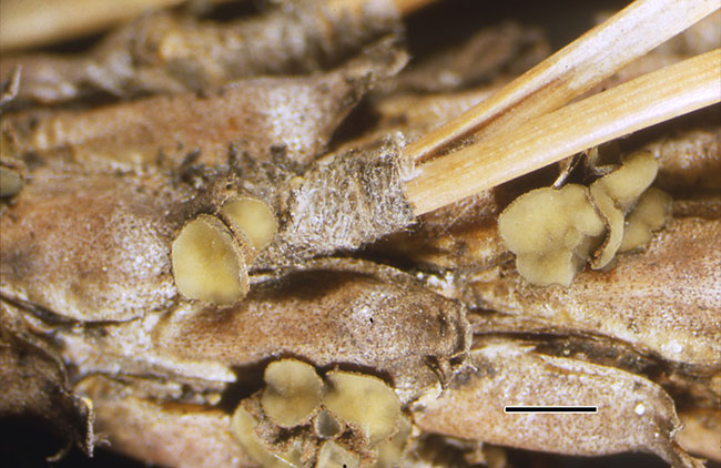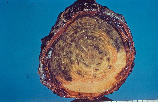DESCRIPTION: The disease causes slow dieback of the bark of various pine species. Thinner infected branches usually die back. There are often resin drops on the edge of infected areas. Slowly spreading canker wounds form on the trunk, mostly at branch axils. In the bark, the fungus grows about 5 cm/year vertically and 0.6 cm/year horizontally, and thus the wound becomes very elongated. The wood acquires characteristic bluish-black stains. On the surface of the wound small, black, disc-shaped and stalked fruiting bodies (apothecia) develop.