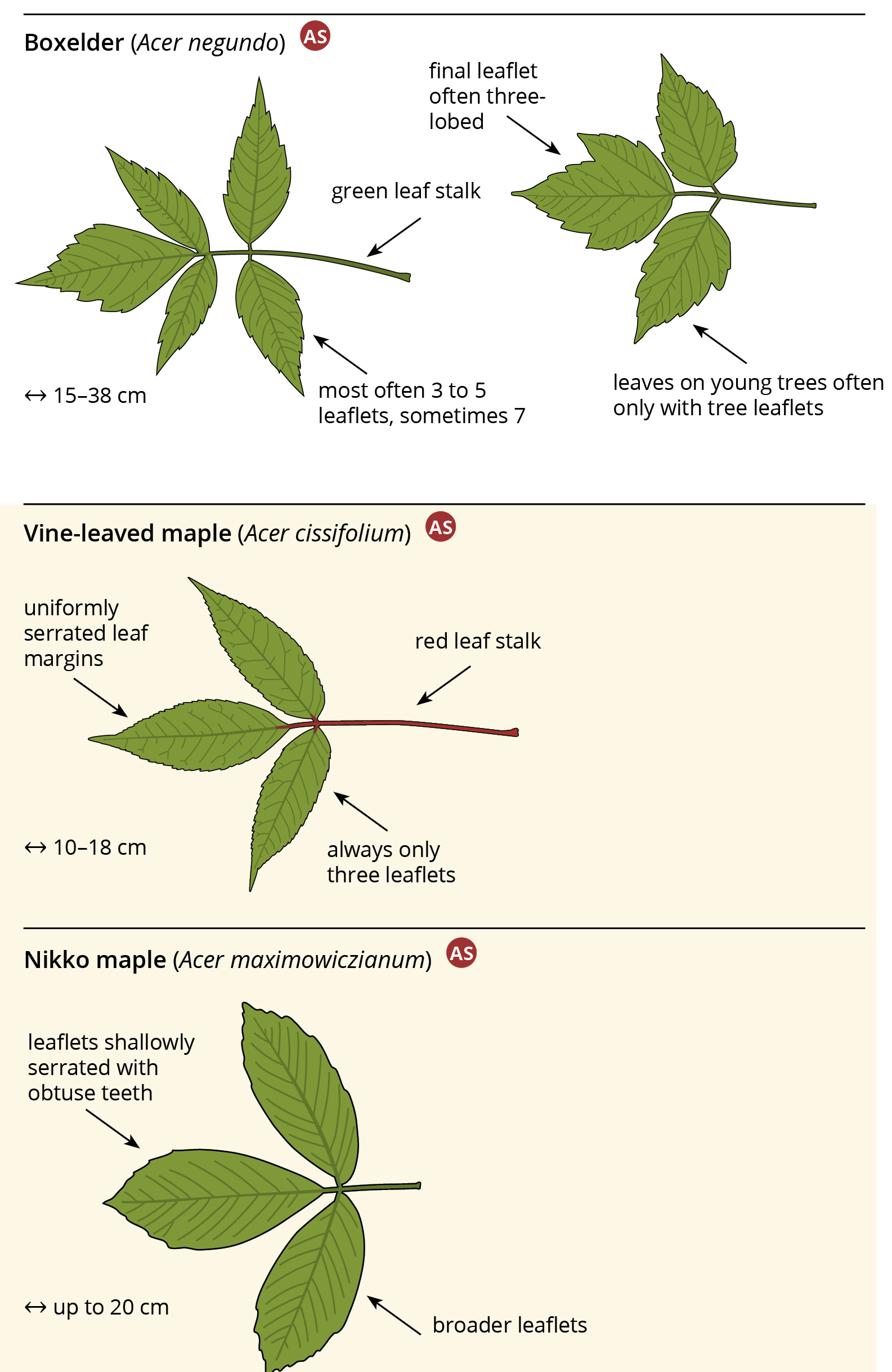 SIMILAR SPECIES: Vine-leaved maple (Acer cissifolium) and Nikko maple (Acer maximowiczianum) have similar compound leaves with three leaflets. Vine-leaved maple always has only three leaflets which have serrated margins and red stalks. Nikko maple has broad leaflets which are shallowly serrated with obtuse teeth. The undersides of its leaves are hairy and greyish.