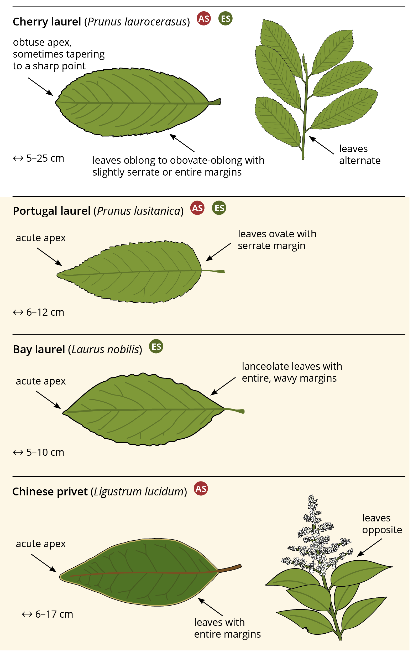 SIMILAR SPECIES: Portugal laurel (Prunus lusitanica), has smaller ovate leaves with an acute apex and dentate margins. Flowers are borne in arching clusters. The bark of young shoots is red. Bay laurel (Laurus nobilis) has leaves with entire, but wavy margins. Flowers are yellow-green, 1 cm across, borne paired in leaf axils. Leaves of Chinese privet (Ligustrum lucidum) are placed opposite and have entire leaf margins.