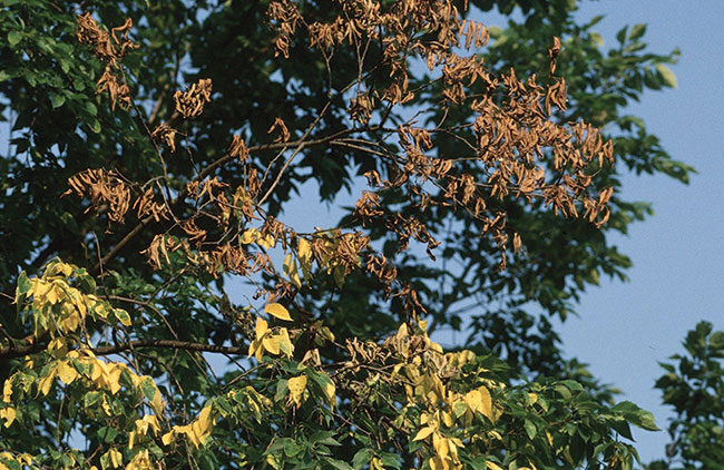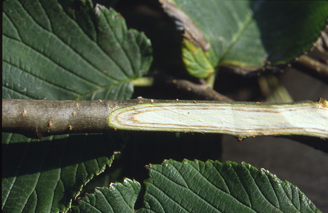 DESCRIPTION: This fungus causes a disease of water conducting tissues of trees (tracheomycosis). Because water conducting cells are blocked, the branches wilt and eventually die back. The fungus quickly spreads through the wood and infected trees die back within a few years. A typical disease symptom is a brown streaking in the previous year’s annual ring of the wood in the affected branches. The infection is often accelerated by attacks by elm bark beetles (Scolytus spp.). Adult beetles carry the fungal spores on their bodies and in their faeces, which they spread to healthy trees in the surroundings.