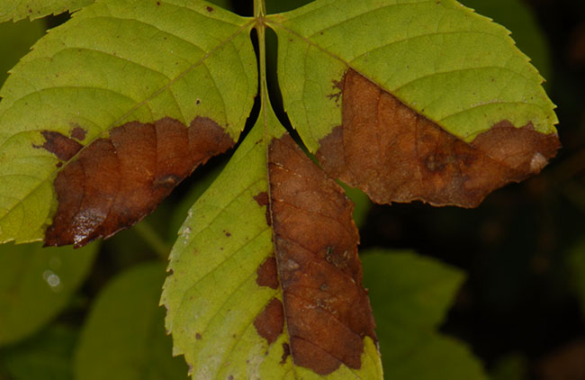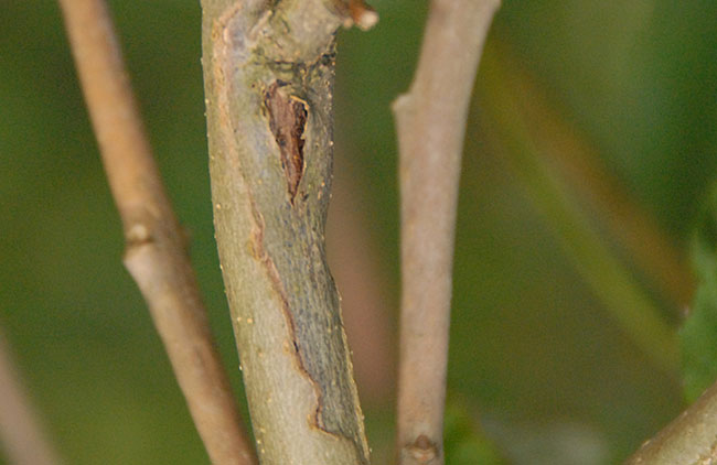 OPIS: Na listih in listnih pecljih jesenov opazimo odmrle rjave pege, kjer je gliva prodrla v rastlino. Okuži tudi skorjo, ki naglo odmira in zaradi česar se posuši celoten poganjek. Na deblih nastajajo veliki ovalni predeli odmrle skorje, ki se običajno naglo povečujejo. Včasih skorja ne odmre in drevo začne rano zaraščati – nastane rak. Okužbe občutljivih dreves so navadno množične, vendar drevo močno odganja iz spečih brstov, tako da opazimo številne odmrle veje in odganjajoče žive poganjke.
