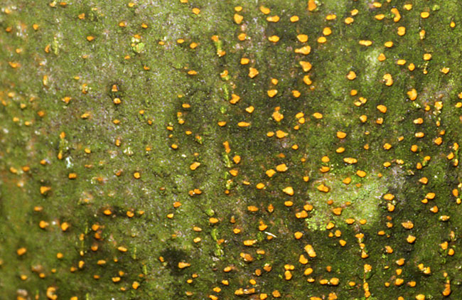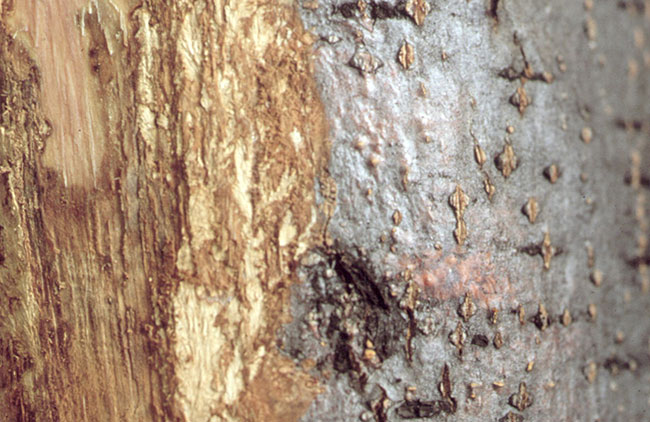 OPIS: Bolezen obstaja v dveh oblikah: virulentni (tipični) in hipovirulentni (neškodljivi za drevo), ki je posledica okužbe glive z virusi. Virulentna oblika napreduje hitro in drevo odmre. Najprej se spremeni barva skorje, ki potemni ali postane oranžna. Če skorjo odstranimo, opazimo podgobje glive v obliki drobnih pahljačic. Na skorji so kot bucikina glavica velika oranžna do opekasto rdeča trosišča. Hipovirulentna oblika povzroča le drobno razpokanost skorje in rahlo hipertrofijo veje ali debla.