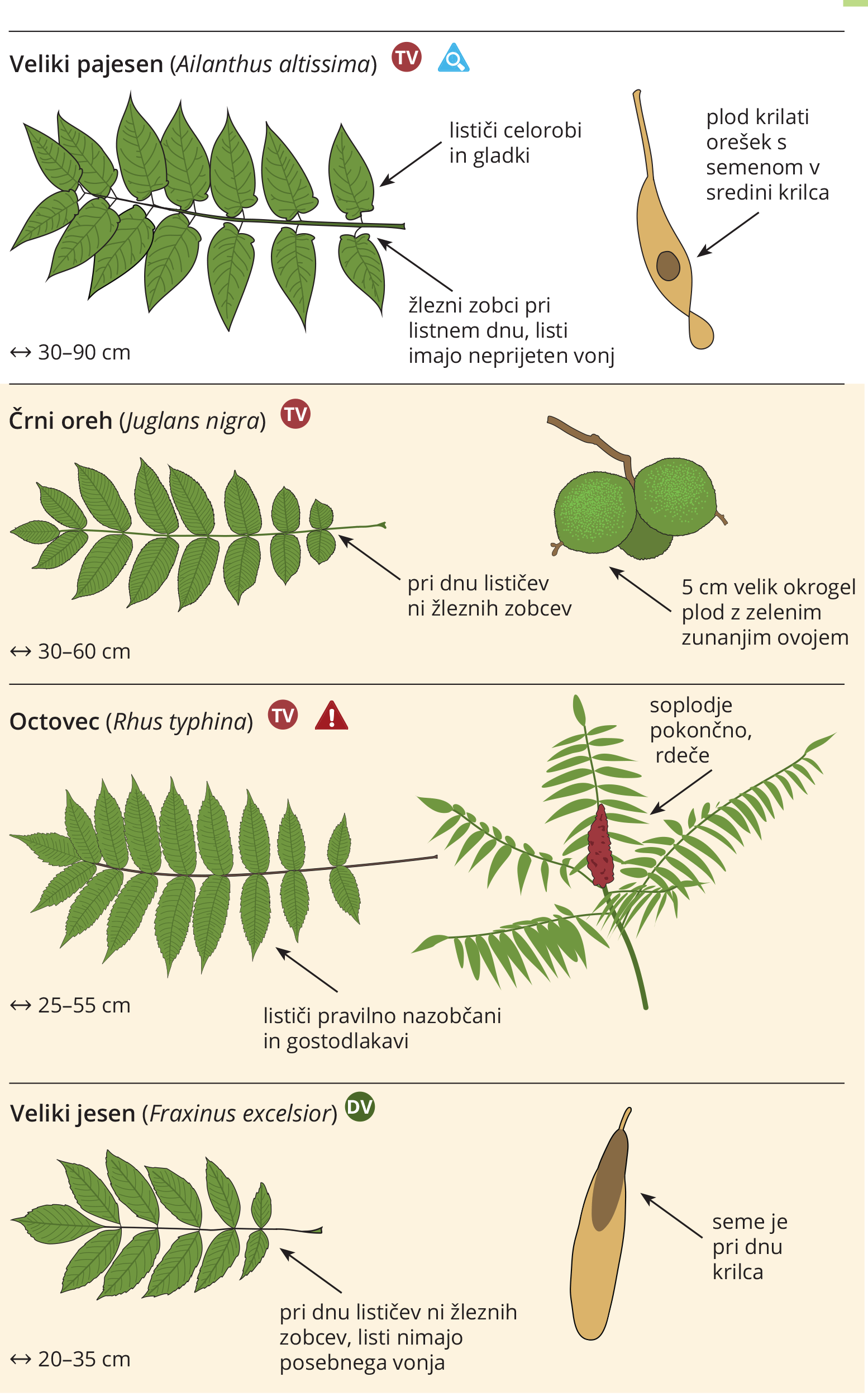 PODOBNE VRSTE: Domorodni veliki jesen (Fraxinus excelsior) ter tujerodni črni oreh (Juglans nigra), man-džurski oreh (J. mandshurica) in octovec (Rhus typhina) pri listnem dnu nimajo žleznih zobcev. Octovec ima nazobčane, gostodlakave lističe in pokončno soplodje.