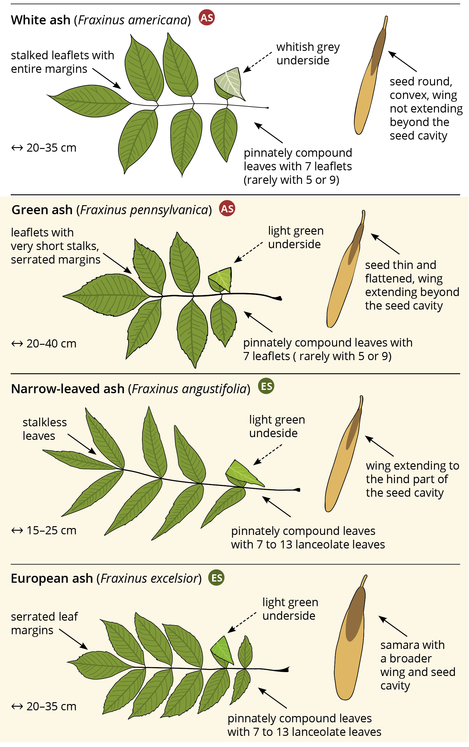 SIMILAR SPECIES: Leaves of green ash (F. pennsylvanica), narrow-leaved ash (F. angustifolia) and European ash (F. excelsior) have green underside. Green ash has grey to green-brown twigs which can be glabrous or pubescent. The seed in the samara is flattened, with a wing extending beyond the seed cavity. The samaras of European ash are broader.